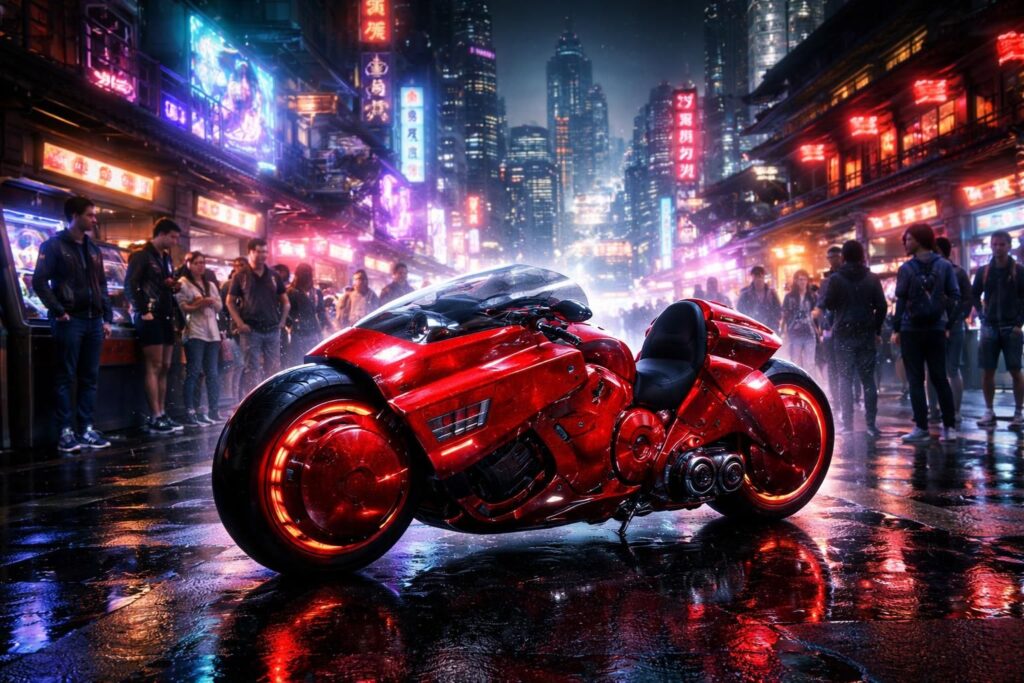 Ce renouveau ne se limite pas à la nostalgie, mais se traduit par une exploration active des thèmes de la culture cyberpunk, souvent via des créations artisanales de répliques. Les exhibitions de motos custom sont désormais courantes, et des entreprises artisanales créent des modèles inspirés de la moto d’Akira, adaptés aux critères modernes tout en conservant l’identité de ce véhicule légendaire.