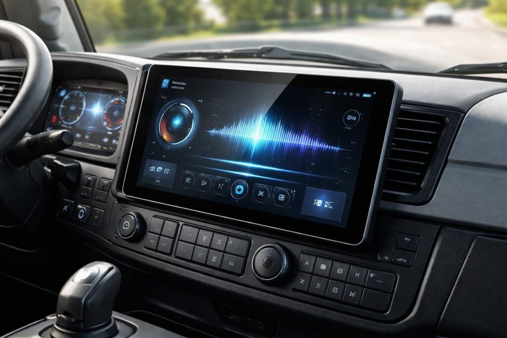découvrez notre tablette windows conçue comme un cockpit multimédia pour camion, offrant un son de qualité et un affichage optimal pour une expérience de conduite améliorée.