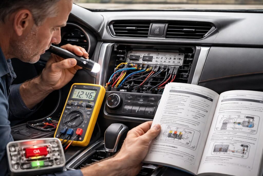 Utilisez un multimètre pour tester la continuité de l’alimentation vers l’autoradio. Placez les sondes sur les bornes d’alimentation et vérifiez que la tension est conforme aux spécifications du fabricant. Si la tension est absente ou trop basse, le problème pourrait venir de la source d’alimentation.